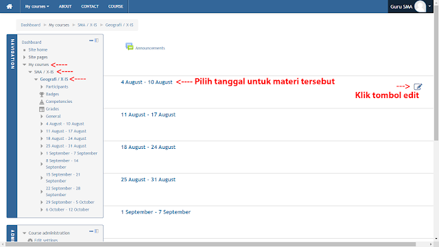 Setelah kelas & pelajaran telah dibuat oleh administrator/manager Moodle, peran selanjutnya dapat digantikan/diteruskan oleh guru (teacher) dalam hal ini saya akan mencontohkan bagaimana menambahkan materi pelajaran.